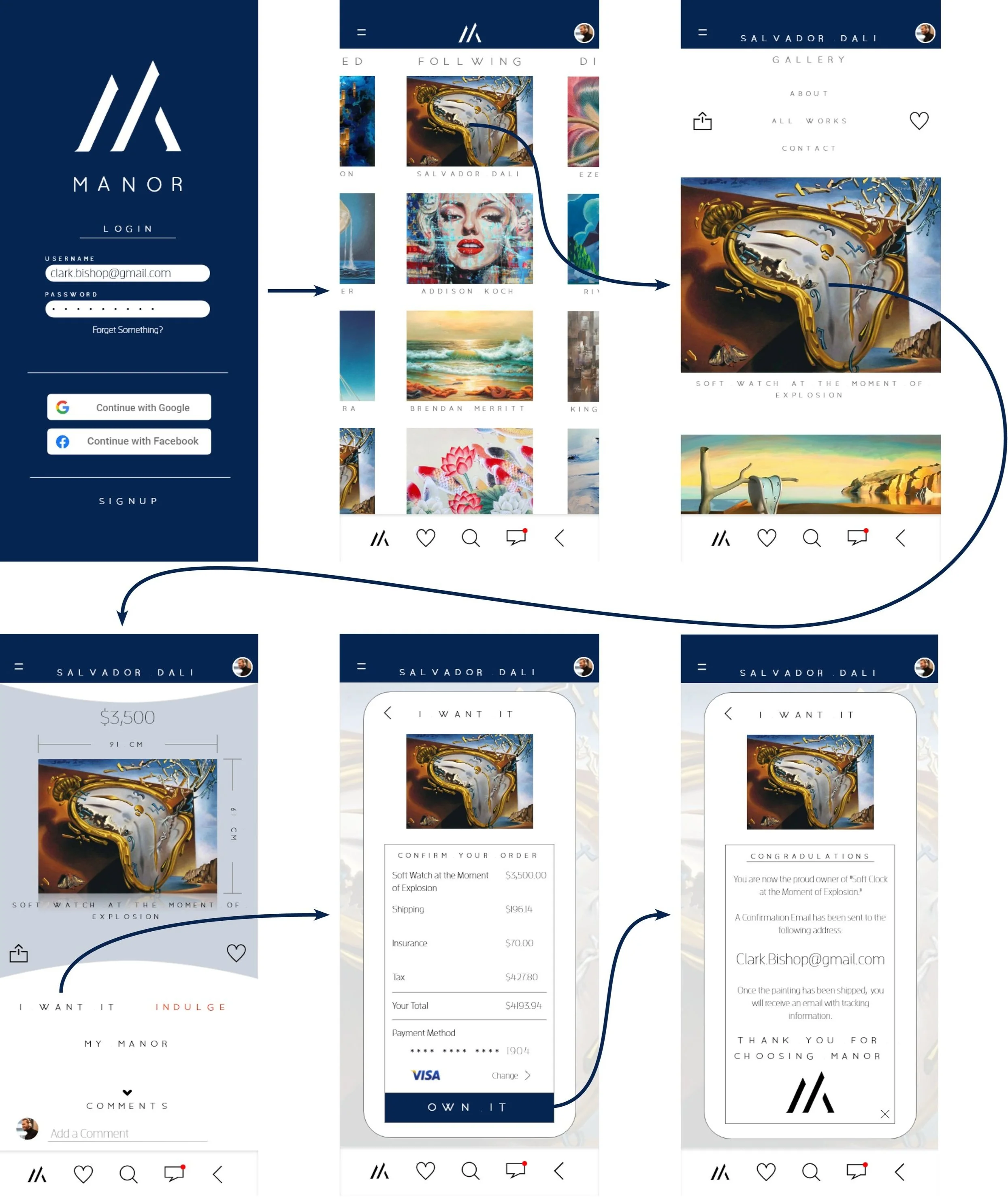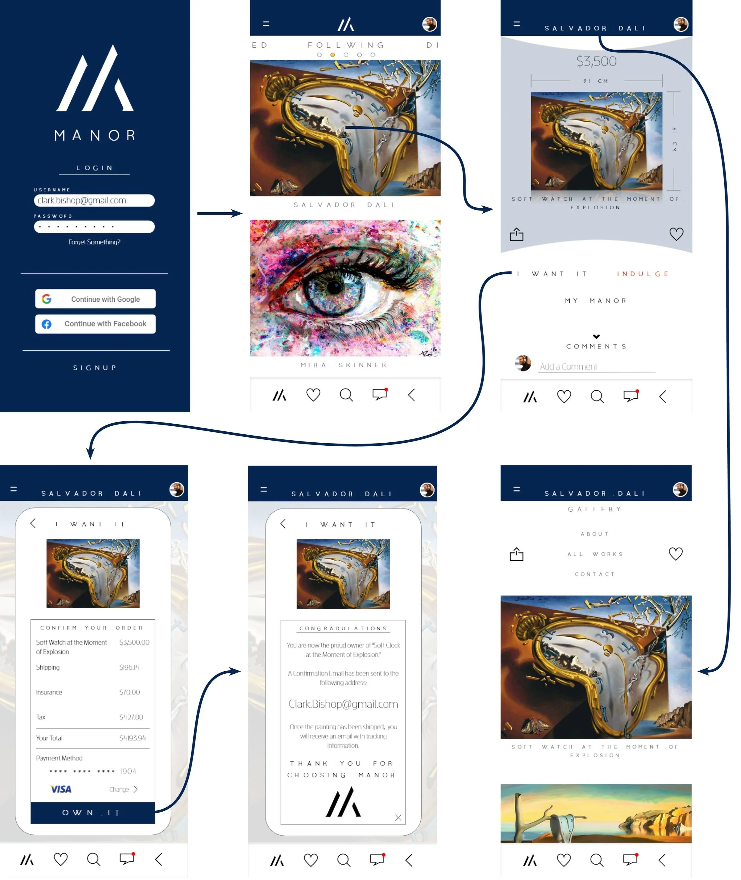 As product designer, I worked with two MBA students to create an application for their company Manor Ltd. Manor is a social media platform and marketplace which seeks to empower and connect artists, galleries, collectors, and enthusiasts of art under a single roof. Their mission is to encourage and expand the communication around art and open further avenues for engaging in the procurement and sale of artwork. As such, they are well situated in an old market with change on the horizon.