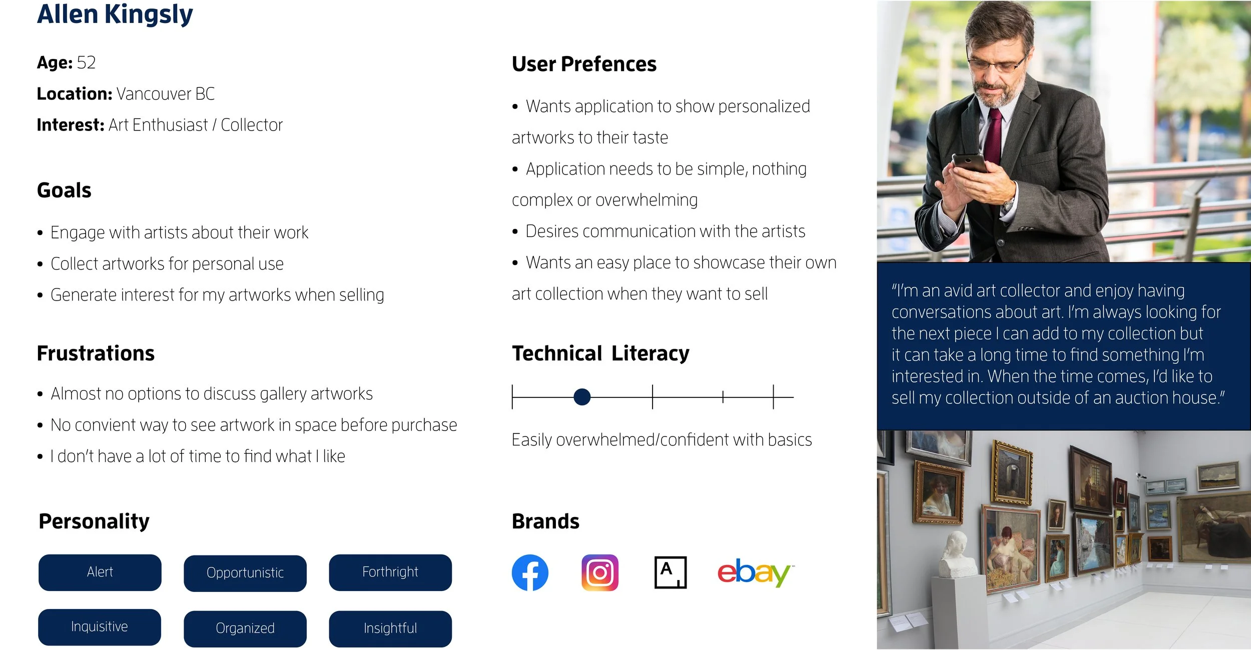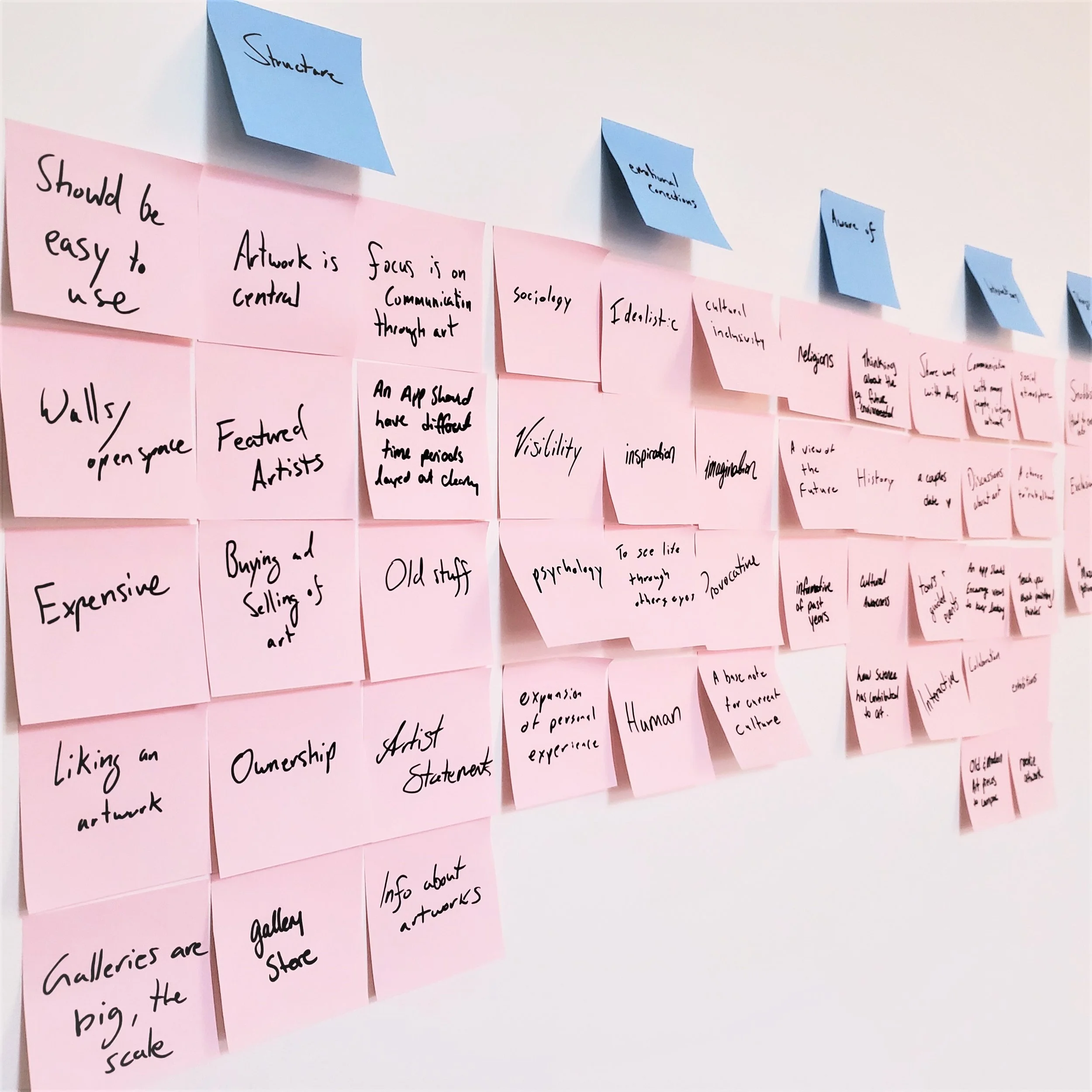 We began by listing and organizing the assumptions we had about how galleries function, and what a platform for selling artwork should look like. This then informed what our key deliverables should be throughout the design process. An affinity board was essential for us to get a top down view of our company’s goals and discovered communication and interactions to be at the very heart of what we would be developing. Our brand, while utilizing a similar feature set as our competitors, will differentiate itself by acting as a communications platform with a focus on artworks. Additionally, the implementation of augmented reality to view artworks in your own home will further the sale of artworks over our competition.