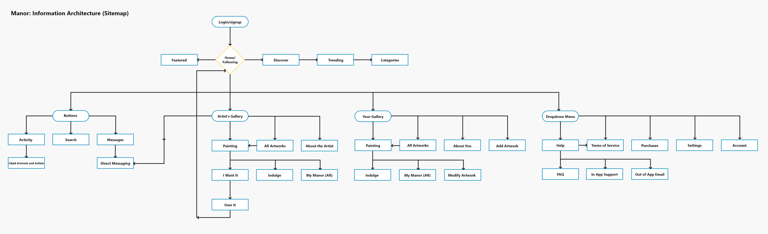 Changes to the application involved adding a small page signifier to the top of the home page in order to aid the user’s conceptual model of Manor’s features. Furthermore, the artist gallery page was moved after the artwork in the sitemap. These changes would limit user pains in future rounds of user testing to bring the product to market.